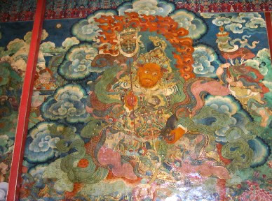 3.護法殿則畫憤怒尊,例如閻魔護法.普巴金剛..,連天花板梁柱都有裝飾圖案