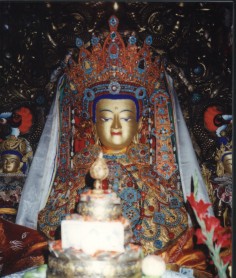 | 上圖:為"覺沃佛"即釋迦牟尼佛,高1.5公尺,佛陀12歲時等身鍍金銅質雕像,係佛陀時代雕刻家毗首羯摩的作品,是唐朝文成公主從長安請去的佛像,供奉在拉薩大昭寺,頭上佛冠是1409年宗喀巴大師獻上的金製鑲玉寶冠,朝聖者往往為了朝拜此尊佛陀造像,不遠千里而來.