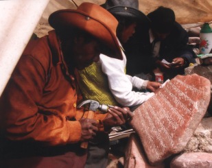 石雕藝術:在西藏地區幾乎隨處可見,從佛像.佛塔.咒語.經文到建築材料.日常生活用品(石桌椅.石磨..)等,石雕精品係經選材.用筆放樣圖文.雕刻(採淺雕.浮雕或立體雕法).彩繪裝飾過程完成的.