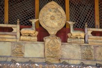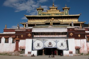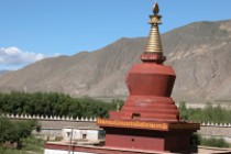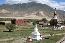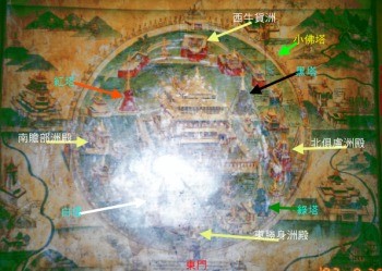 | 桑耶寺:(一) 位於西藏山南地區扎囊縣的扎瑪山麓,建於八世紀中葉藏王赤松德贊時期,<<西藏王臣記 >>記載為西 元762~766年計五年竣工,<<西藏王統記>>則有十二年之說.是西藏第一座佛.法.僧三寶具足的寺院.清初原建物毀於火災,目前的建築是後來所重建的. 一.桑耶寺又稱桑鳶寺.三樣寺,是座揉合藏.漢.印風格為一體的建築,也是西藏古建築中最有特色的建築 群之一,其總平面圖為圓形,建築配置依據佛教的世界觀中之小千世界設計,中心為方形大殿殿高三層,表須彌山,主殿四周的東.西.南.北向各有一殿表四大洲,每一殿旁各建二小殿表八小洲,主殿左右又各別建一座佛殿表日.月,大殿四角落各有紅.白.綠.黑四塔表法輪.菩提.天降.舍利等,外圍圓形圍牆表鐵山,圍牆的東.西.南.北各向都有一大門,東門為正門,牆頭每約一公尺就有小塔一座. |