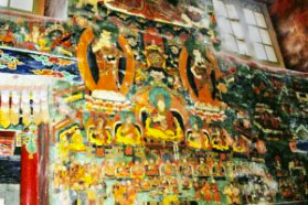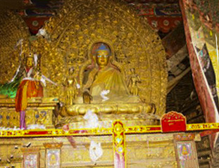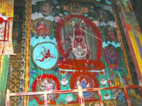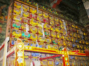 | 薩迦寺:(二).大殿佛像後面.左右面等全是貼牆直到頂的超大書架,是著名經書牆,藏書量數以萬計,其餘各殿等建物收藏量相當浩瀚,除經典外,還有大量有關歷史.地理.天文.歷算.醫學.哲學.文學.藝術等等文獻,以及經文印刷版.大量古代壁畫.陶瓷.法器.貝葉經.供器.刺繡.塑像.法王遺物.種類繁多,所以有"第二敦煌"的稱譽. | |