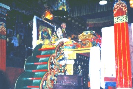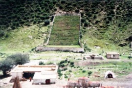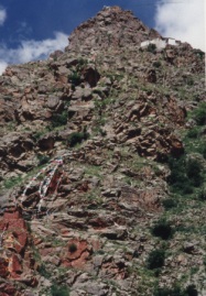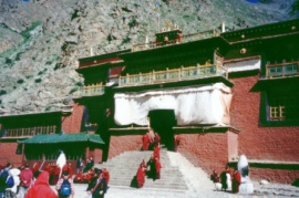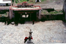 一.楚布寺建築平面配置,是以大殿為主體建築,左.右.後方則為扎倉.僧舍等附屬大小建物,依山順勢.錯落重疊而建.進寺門有大廣場,中央有9世紀江浦建寺碑古物,對面即楚布河的南岸有座大的展佛台,後山頂上有座白色建築--閉關中心,這是座近千年的古剎.